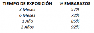 - «La posibilidad de embarazo, cuando el contacto sexual es en el periodo de la ovulación, en una pareja menor de 35 años y sin ningún factor de infertilidad, es sólo de 18 a 35% por mes». El problema, es que a partir de los 35 años la fertilidad de la mujer va disminuyendo año a año, siendo la probabilidad de gestación menor de un 10% al mes, cuando se pasa de los 40 años.