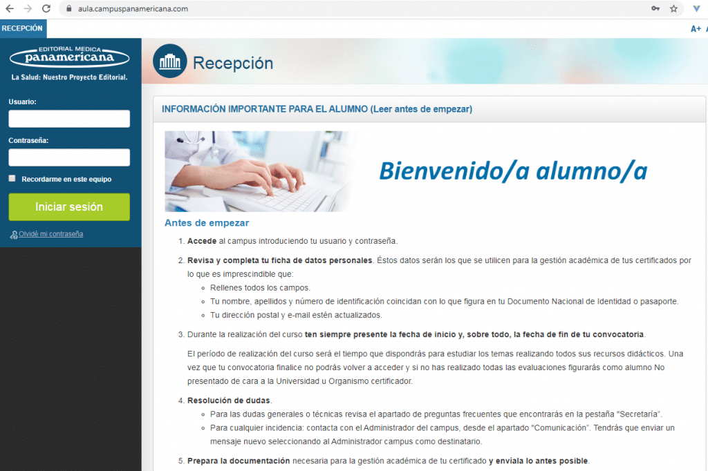 Con estos datos ya puedes acceder al campus en la dirección: https://aula.campuspanamericana.com/